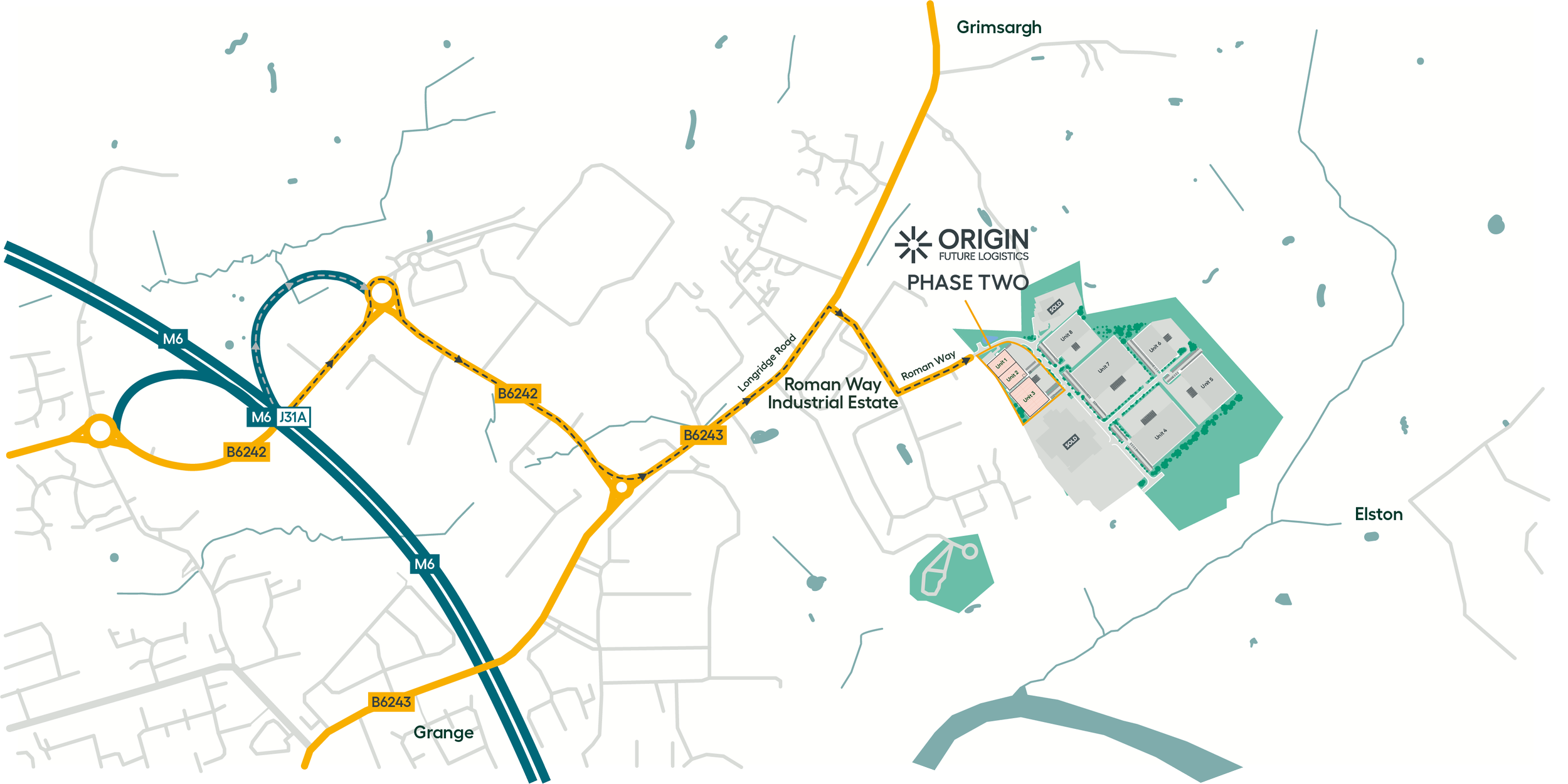 1.5 miles east of junction 31A of the M6
